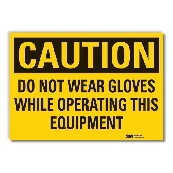 Caution Sign, Horizontal Rectangle, Number of Printed Sides 1, English, Sign Format Traditional OSHA, Sign Legend Do Not Wear Gloves While Operating This Equipment, Sign Legend Background Color Yellow, Sign Legend Style Text