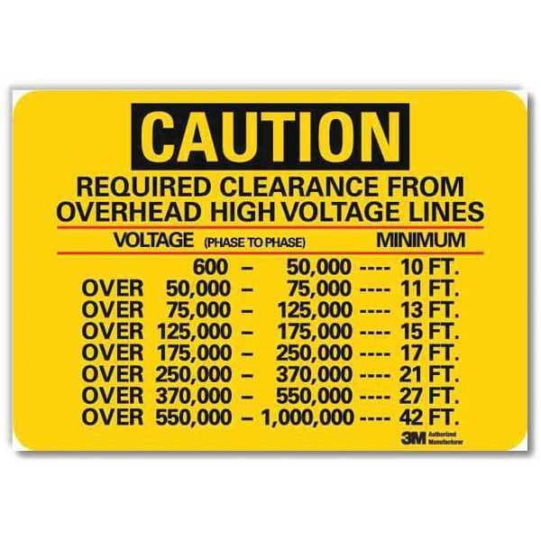 Caution Sign, Horizontal Rectangle, Number of Printed Sides 1, English, Sign Format Traditional OSHA, Sign Legend Required Clearances From Overhead High Voltage Lines, Sign Legend Background Color Yellow, Sign Legend Style Text