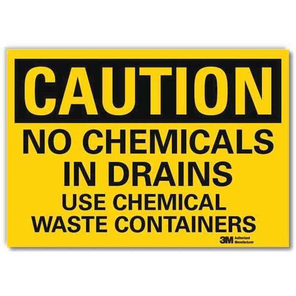 Caution Sign, Vertical Rectangle, Number of Printed Sides 1, English, Sign Format Traditional OSHA, Sign Legend No Chemicals In Drains Use Chemical Waste Containers, Sign Legend Background Color Yellow, Sign Legend Style Text