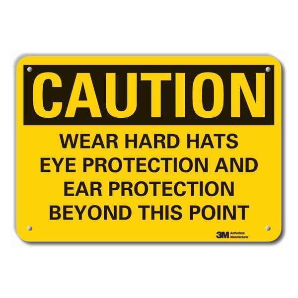 Caution Sign, Vertical Rectangle, Number of Printed Sides 1, English, Sign Format Traditional OSHA, Sign Legend Wear Hard Hats Eye Protection And Ear Protection Beyond This Point, Sign Legend Background Color Yellow, Sign Legend Style Text