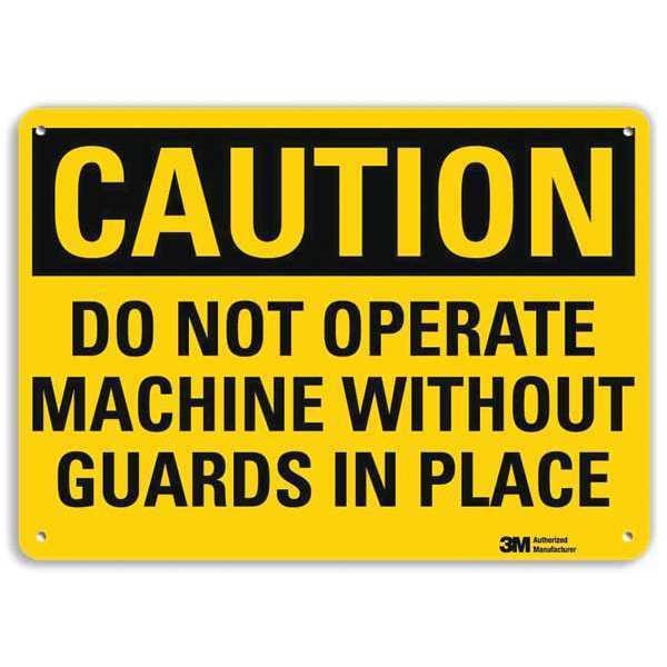 Caution Sign, Vertical Rectangle, Number of Printed Sides 1, English, Sign Format Traditional OSHA, Sign Legend Do Not Operate Machine Without Guards In Place, Sign Legend Background Color Yellow, Sign Legend Style Text