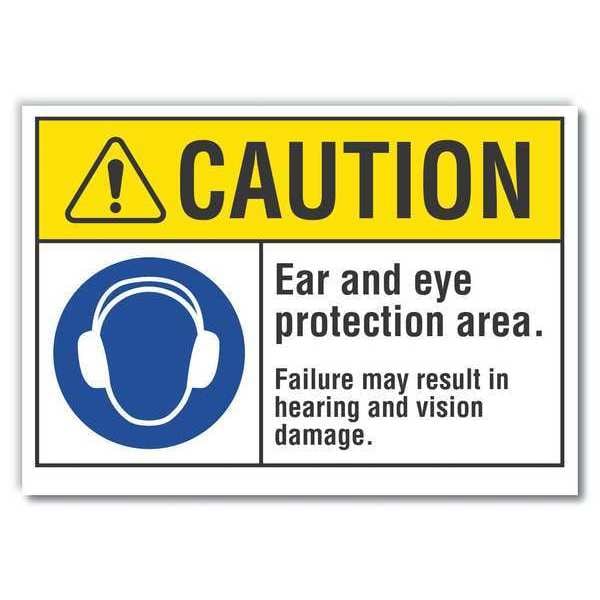 Caution Sign, Horizontal Rectangle, Number of Printed Sides 1, English, Sign Format ANSI/OSHA Format, Sign Legend Ear And Eye Protection Area. Failure May Result In Hearing And Vision Damage., Sign Legend Background Color White, Sign Legend Style Symbol and Text