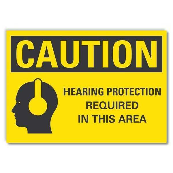 Caution Sign, Horizontal Rectangle, Number of Printed Sides 1, English, Sign Format ANSI/OSHA Format, Sign Legend Hearing Protection Required In This Area, Sign Legend Background Color Yellow, Sign Legend Style Symbol and Text