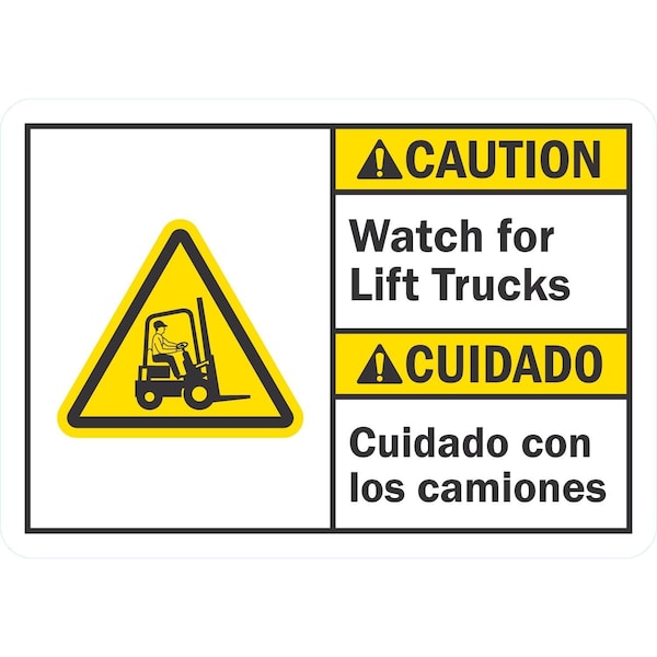 Caution Watch For Lift Trucks (W/Sym) (Bilingual), 5x3.5, Non-Reflective, White