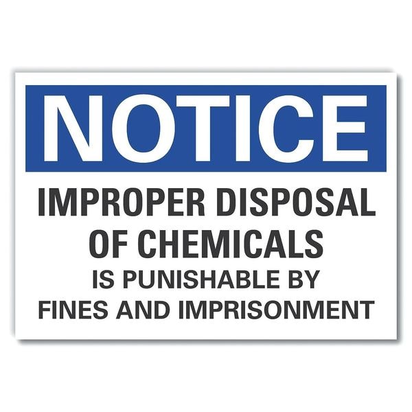 Chemical Disposal Notice Label, Horizontal Rectangle, Number of Printed Sides 1, English, Sign Format ANSI/OSHA Format, Sign Legend Improper Disposal Of Chemicals Is Punishable By Fines And Imprisonment, Sign Legend Background Color White, Sign Legend Style Text