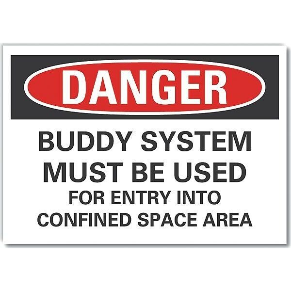 Confined Space Danger Label, Horizontal Rectangle, Number of Printed Sides 1, English, Sign Format Traditional OSHA, Sign Legend Buddy System Must Be Used For Entry Into Confined Space Area, Sign Legend Background Color White, Sign Legend Style Text