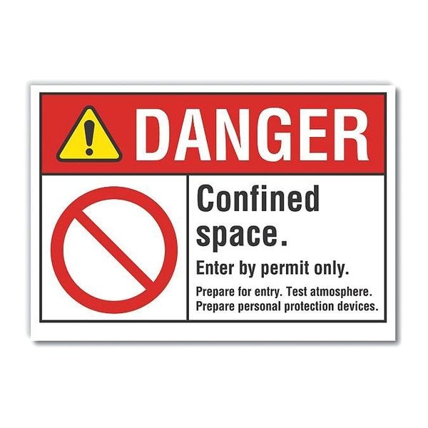 Confined Space Danger Label, Horizontal Rectangle, Number of Printed Sides 1, English, Sign Format ANSI/OSHA Format, Sign Legend Confined Space. Enter By Permit Only. Prepare For Entry. Test Atmosphere. Prepare Personal Protection Devices., Sign Legend Background Color White, Sign Legend Style Symbol and Text