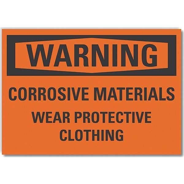 Corrosive Materials Warning Label, Horizontal Rectangle, Number of Printed Sides 1, English, Sign Format Traditional OSHA, Sign Legend Corrosive Materials Wear Protective Clothing, Sign Legend Background Color Orange, Sign Legend Style Text