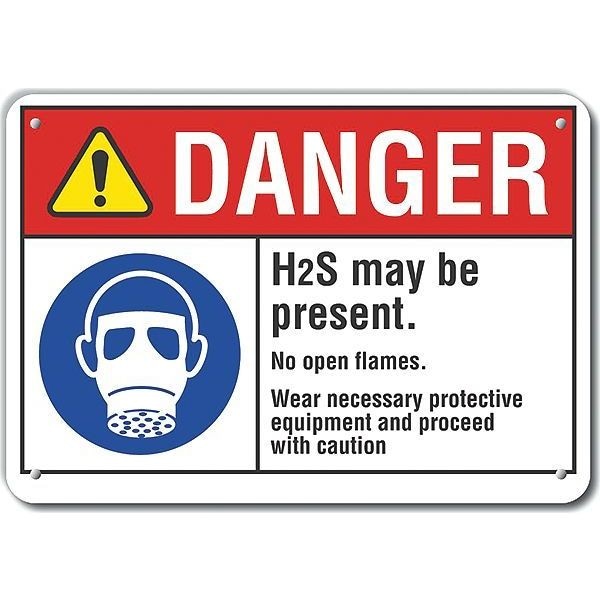Danger Sign, Horizontal Rectangle, Number of Printed Sides 1, English, Sign Format ANSI/OSHA Format, Sign Legend H2S May Be Present. No Open Flames. Wear Necessary Protective Equipment And Proceed With Caution., Sign Legend Background Color White, Sign Legend Style Symbol and Text