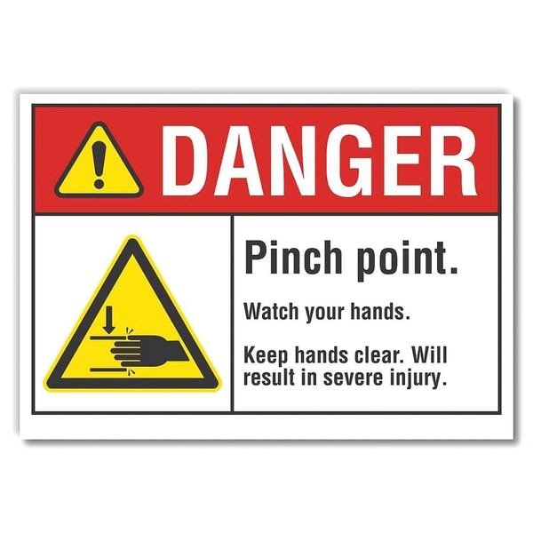 Danger Sign, Horizontal Rectangle, Number of Printed Sides 1, English, Sign Format ANSI/OSHA Format, Sign Legend Pinch Point. Watch Your Hands. Keep Hands Clear. Will Result In Severe Injury., Sign Legend Background Color White, Sign Legend Style Symbol and Text