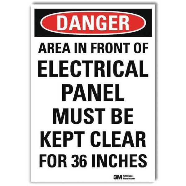 Danger Sign, Horizontal Rectangle, Number of Printed Sides 1, English, Sign Format Traditional OSHA, Sign Legend Area In Front Of Electrical Panel Must Be Kept Clear For 36 Inches, Sign Legend Background Color White, Sign Legend Style Text