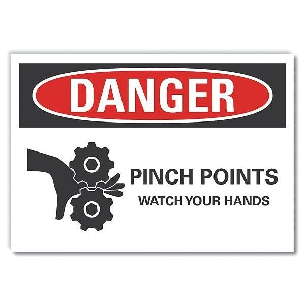 Danger Sign, Horizontal Rectangle, Number of Printed Sides 1, English, Sign Format ANSI/OSHA Format, Sign Legend Pinch Points Watch Your Hands, Sign Legend Background Color White, Sign Legend Style Symbol and Text