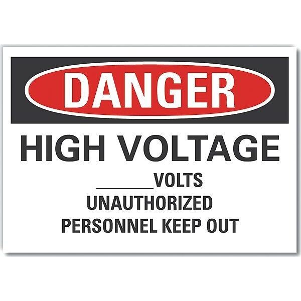 Danger Sign, Horizontal Rectangle, Number of Printed Sides 1, English, Sign Format Traditional OSHA, Sign Legend High Voltage ___Volts Unauthorized Personnel Keep Out, Sign Legend Background Color White, Sign Legend Style Text