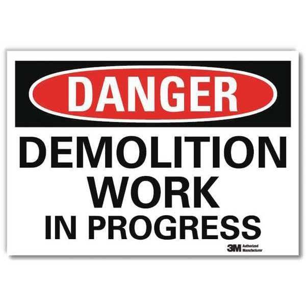 Danger Sign, Horizontal Rectangle, Number of Printed Sides 1, English, Sign Format Traditional OSHA, Sign Legend Demolition Work In Progress, Sign Legend Background Color White, Sign Legend Style Text