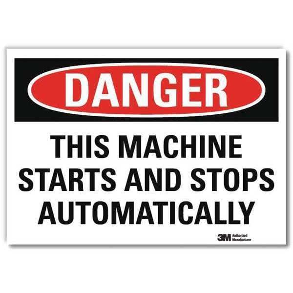 Danger Sign, Horizontal Rectangle, Number of Printed Sides 1, English, Sign Format Traditional OSHA, Sign Legend This Machine Starts And Stops Automatically, Sign Legend Background Color White, Sign Legend Style Text