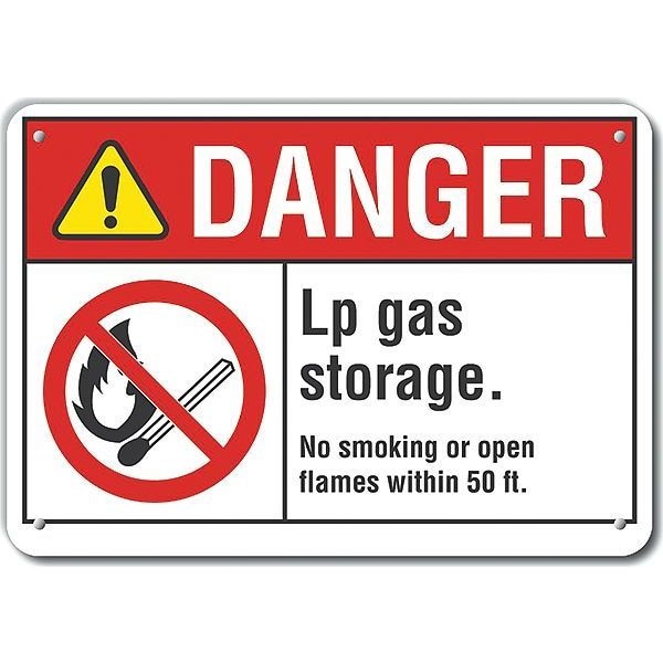 Danger Sign, Vertical Rectangle, Number of Printed Sides 1, English, Sign Format ANSI/OSHA Format, Sign Legend Lp Gas Storage. No Smoking Or Open Flames Within 50 Ft., Sign Legend Background Color White, Sign Legend Style Symbol and Text