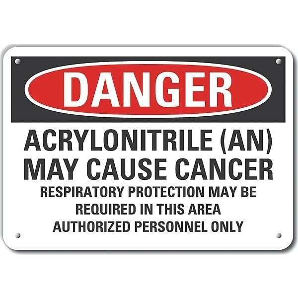 Reflective Acrylonitrile Danger Sign, Vertical Rectangle, Number of Printed Sides 1, English, Sign Format Traditional OSHA, Sign Legend Acrylonitrile (An) May Cause Cancer Respiratory Protection May Be Required In This Area Authorized Personnel Only, Sign Legend Background Color White, Sign Legend Style Text