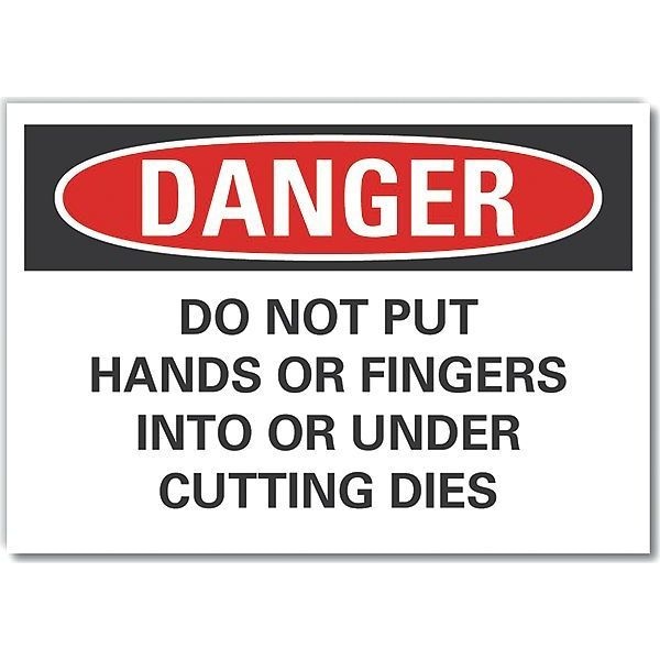 Danger Sign, Horizontal Rectangle, Number of Printed Sides 1, English, Sign Format Traditional OSHA, Sign Legend Do Not Put Hands Or Fingers Into Or Under Cutting Dies, Sign Legend Background Color White, Sign Legend Style Text