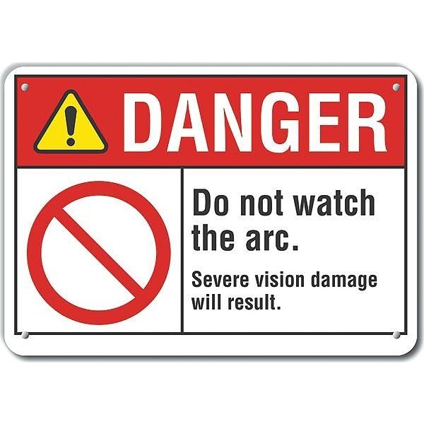 Plastic Welding Danger Sign, Vertical Rectangle, Number of Printed Sides 1, English, Sign Format ANSI/OSHA Format, Sign Legend Do Not Watch The Arc. Severe Vision Damage Will Result., Sign Legend Background Color White, Sign Legend Style Symbol and Text