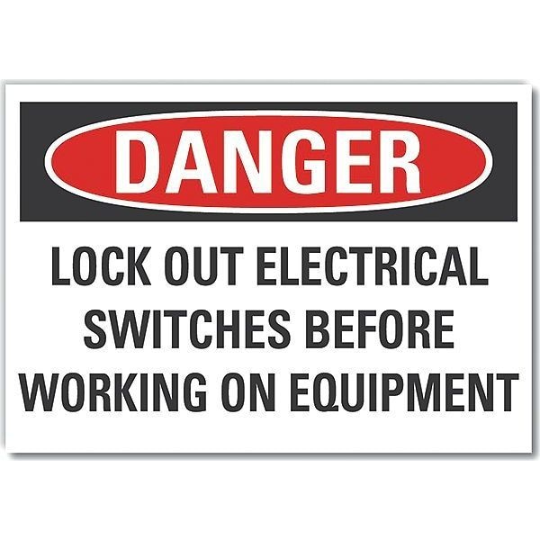 Danger Sign, Horizontal Rectangle, Number of Printed Sides 1, English, Sign Format Traditional OSHA, Sign Legend Lock Out Electrical Switches Before Working On Equipment, Sign Legend Background Color White, Sign Legend Style Text