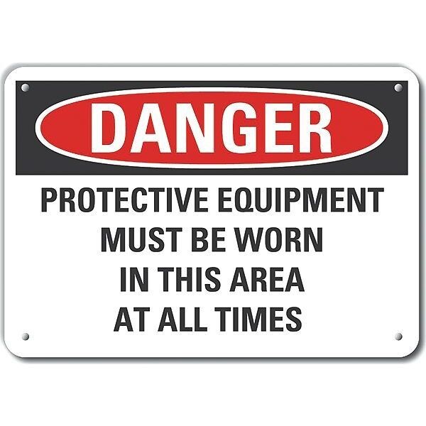 Aluminum Ppe Danger Sign, Horizontal Rectangle, Number of Printed Sides 1, English, Sign Format Traditional OSHA, Sign Legend Protective Equipment Must Be Worn In This Area At All Times, Sign Legend Background Color White, Sign Legend Style Text