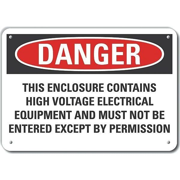 Plastic High Voltage Danger Sign, Horizontal Rectangle, Number of Printed Sides 1, English, Sign Format Traditional OSHA, Sign Legend This Enclosure Contains High Voltage Electrical Equipment And Must Not Be Entered Except By Permission, Sign Legend Background Color White, Sign Legend Style Text