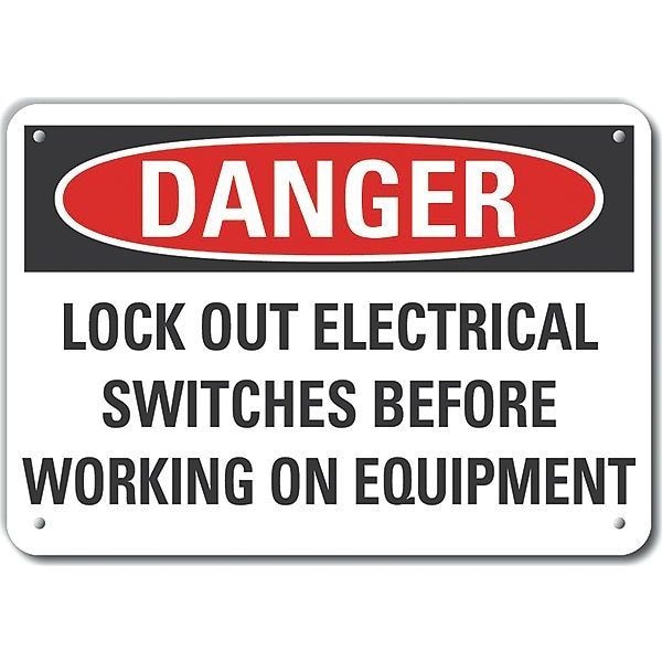Decal,Plastic,Danger Lock Out,10 x 7 In., Vertical Rectangle, Number of Printed Sides 1, English, Sign Format Traditional OSHA, Sign Legend Lock Out Electrical Switches Before Working On Equipment, Sign Legend Background Color White, Sign Legend Style Text