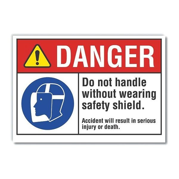 Eye Danger Label, Horizontal Rectangle, Number of Printed Sides 1, English, Sign Format ANSI/OSHA Format, Sign Legend Do Not Handle Without Wearing Safety Shield Accident Will Result In Serious Injury Or Death, Sign Legend Background Color White, Sign Legend Style Symbol and Text