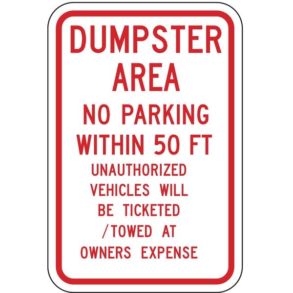 Dumpster No Parking Sign, Height 18 in, Width 12 in, Sign Material Aluminum, Sign Mounting Style Mounting Holes, Printed Language English, Sign Shape Vertical Rectangle
