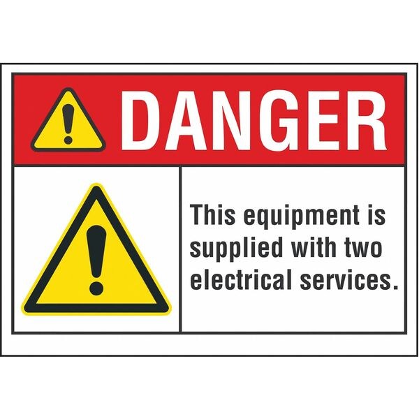 Electrical Hazard Danger Label, Vertical Rectangle, Number of Printed Sides 1, English, Sign Format ANSI/OSHA Format, Sign Legend This Equipment Is Supplied With Two Electrical Services., Sign Legend Background Color White, Sign Legend Style Symbol and Text