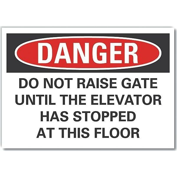 Elevator Hazard Danger Label, Horizontal Rectangle, Number of Printed Sides 1, English, Sign Format Traditional OSHA, Sign Legend Do Not Raise Gate Until The Elevator Has Stopped At This Floor, Sign Legend Background Color White, Sign Legend Style Text