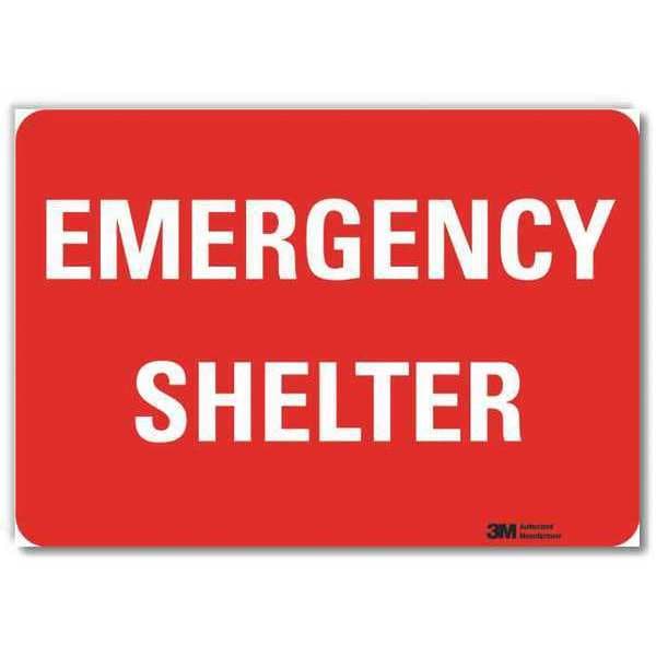 Safety Decal, Horizontal Rectangle, Number of Printed Sides 1, English, Sign Format Other Format, Sign Legend Emergency Shelter, Sign Legend Background Color Red, Sign Legend Style Text