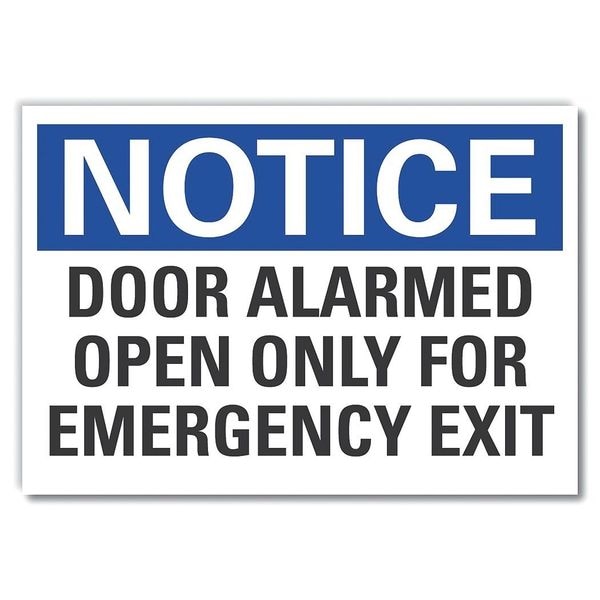 Notice Sign, Vertical Rectangle, Number of Printed Sides 1, English, Sign Format Traditional OSHA, Sign Legend Door Alarmed Open Only For Emergency Exit, Sign Legend Background Color White, Sign Legend Style Text