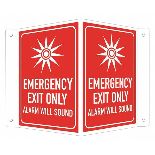 Safety Sign, V-Shape Projection, Number of Printed Sides 1, English, Sign Legend Emergency Exit Only Alarm Will Sound, Sign Legend Background Color Red, Sign Legend Style Symbol and Text