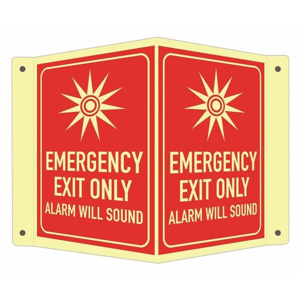Safety Sign, V-Shape Projection, Number of Printed Sides 1, English, Sign Legend Emergency Exit Only Alarm Will Sound, Sign Legend Background Color Red, Sign Legend Style Symbol and Text