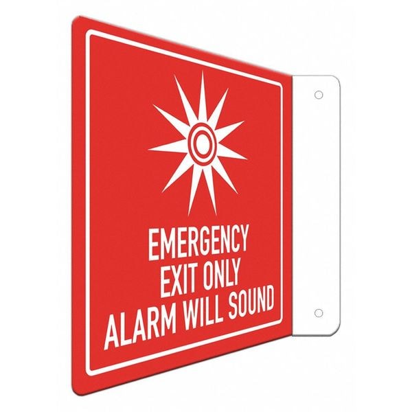 Exit Sign, L-Shape Projection, Number of Printed Sides 2, English, Sign Legend Emergency Exit Only Alarm Will Sound, Sign Legend Background Color Red, Sign Legend Style Symbol and Text