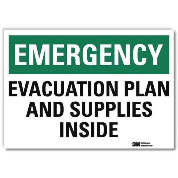 Emergency Exit Sign, Horizontal Rectangle, Number of Printed Sides 1, English, Sign Format Traditional OSHA, Sign Legend Evacuation Plan And Supplies Inside, Sign Legend Background Color White, Sign Legend Style Text