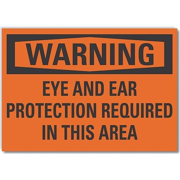 Eye & Ear Warning Label, Horizontal Rectangle, Number of Printed Sides 1, English, Sign Format Traditional OSHA, Sign Legend Eye And Ear Protection Required In This Area, Sign Legend Background Color Orange, Sign Legend Style Text