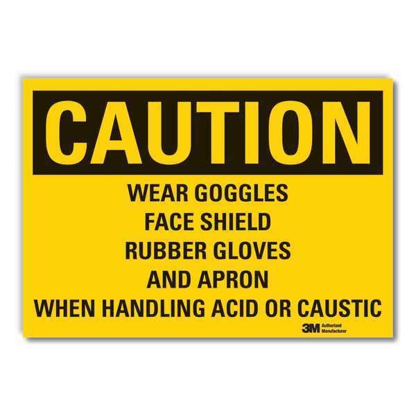 Eye & Hand Caution Reflective Label, Horizontal Rectangle, Number of Printed Sides 1, English, Sign Format Traditional OSHA, Sign Legend Wear Goggles Face Shield Rubber Gloves And Apron When Handling Acid Or Caustic, Sign Legend Background Color Yellow, Sign Legend Style Text