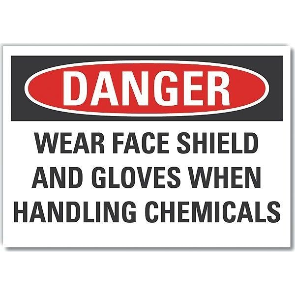 Eye & Hand Danger Label, Horizontal Rectangle, Number of Printed Sides 1, English, Sign Format Traditional OSHA, Sign Legend Wear Face Shield And Gloves When Handling Chemicals, Sign Legend Background Color White, Sign Legend Style Text