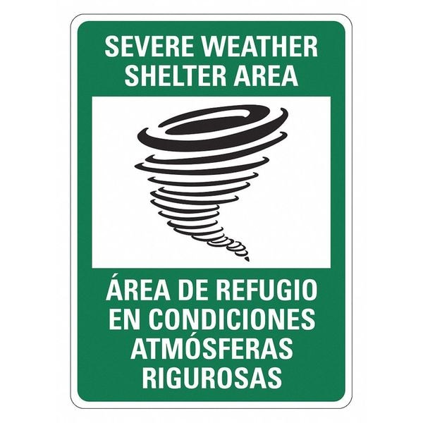 Fire Sign, Vertical Rectangle, Number of Printed Sides 1, English, Spanish, Sign Legend Severe Weather Shelter Area/Area De Refugio En Condiciones Atmosfericas Rigurosas, Sign Legend Background Color Green, Sign Legend Style Symbol and Text