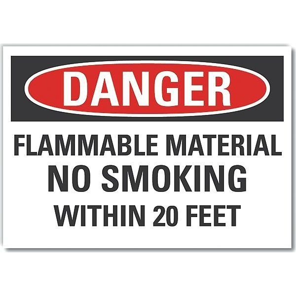 Flammable Material Danger Label, Horizontal Rectangle, Number of Printed Sides 1, English, Sign Format Traditional OSHA, Sign Legend Flammable Material No Smoking Within 20 Feet, Sign Legend Background Color White, Sign Legend Style Text