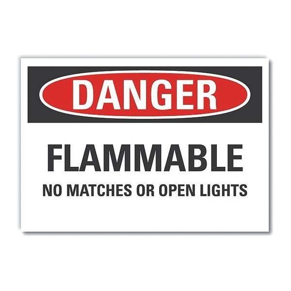 Flammable Material Danger Label, Horizontal Rectangle, Number of Printed Sides 1, English, Sign Format Traditional OSHA, Sign Legend Flammable No Matches Or Open Lights, Sign Legend Background Color White, Sign Legend Style Text