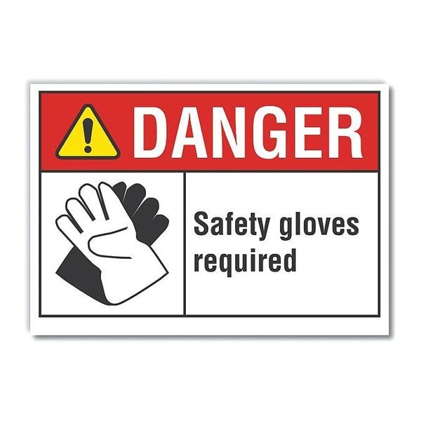 Hand Danger Label, Horizontal Rectangle, Number of Printed Sides 1, English, Sign Format ANSI/OSHA Format, Sign Legend Safety Gloves Required, Sign Legend Background Color White, Sign Legend Style Symbol and Text