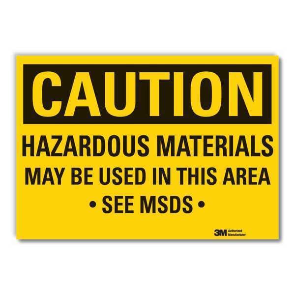 Hazardous Materials Caution Reflective Label, Vertical Rectangle, Number of Printed Sides 1, English, Sign Format Traditional OSHA, Sign Legend Hazardous Materials May Be Used In This Area See Msds, Sign Legend Background Color Yellow, Sign Legend Style Text