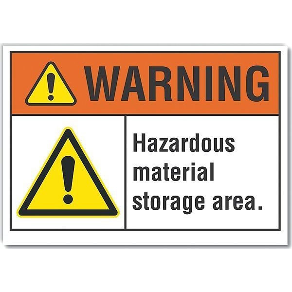 Hazardous Materials Warning Label, Vertical Rectangle, Number of Printed Sides 1, English, Sign Format ANSI/OSHA Format, Sign Legend Hazardous Material Storage Area., Sign Legend Background Color White, Sign Legend Style Symbol and Text