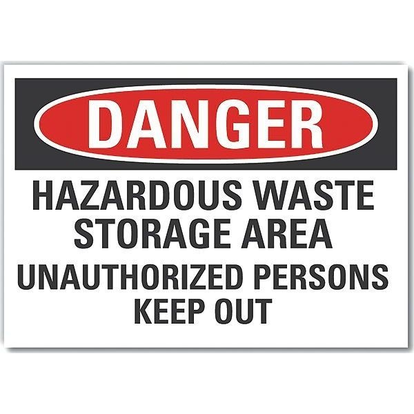 Hazardous Waste Danger Label, Horizontal Rectangle, Number of Printed Sides 1, English, Sign Format Traditional OSHA, Sign Legend Hazardous Waste Storage Area Unauthorized Persons Keep Out, Sign Legend Background Color White, Sign Legend Style Text
