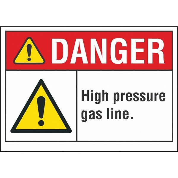 High Pressure Danger Label, Horizontal Rectangle, Number of Printed Sides 1, English, Sign Format ANSI/OSHA Format, Sign Legend High Pressure Gas Line, Sign Legend Background Color White, Sign Legend Style Symbol and Text