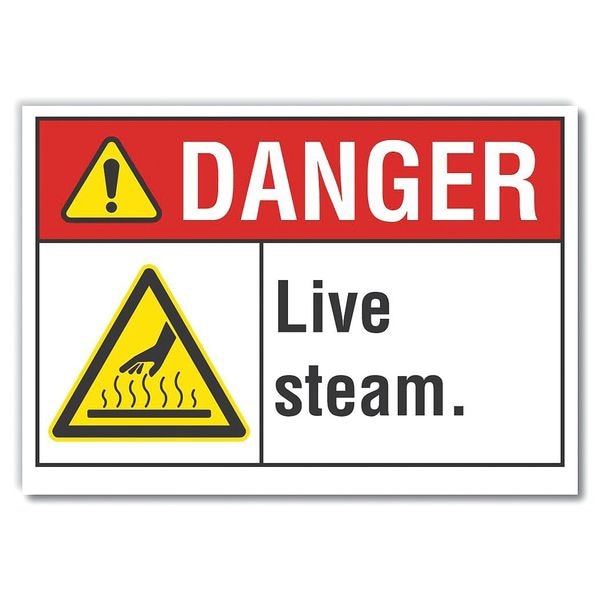 Danger Sign, Horizontal Rectangle, Number of Printed Sides 1, English, Sign Format ANSI/OSHA Format, Sign Legend Live Steam., Sign Legend Background Color White, Sign Legend Style Symbol and Text