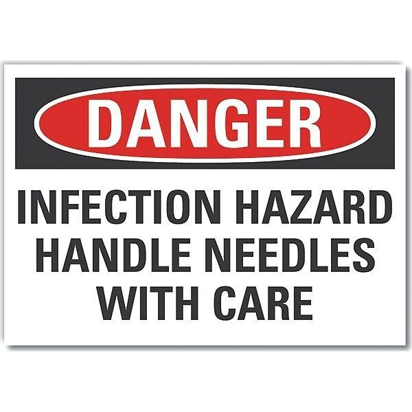 Infection Hazard Danger Label, Vertical Rectangle, Number of Printed Sides 1, English, Sign Format Traditional OSHA, Sign Legend Infection Hazard Handle Needles With Care, Sign Legend Background Color White, Sign Legend Style Text